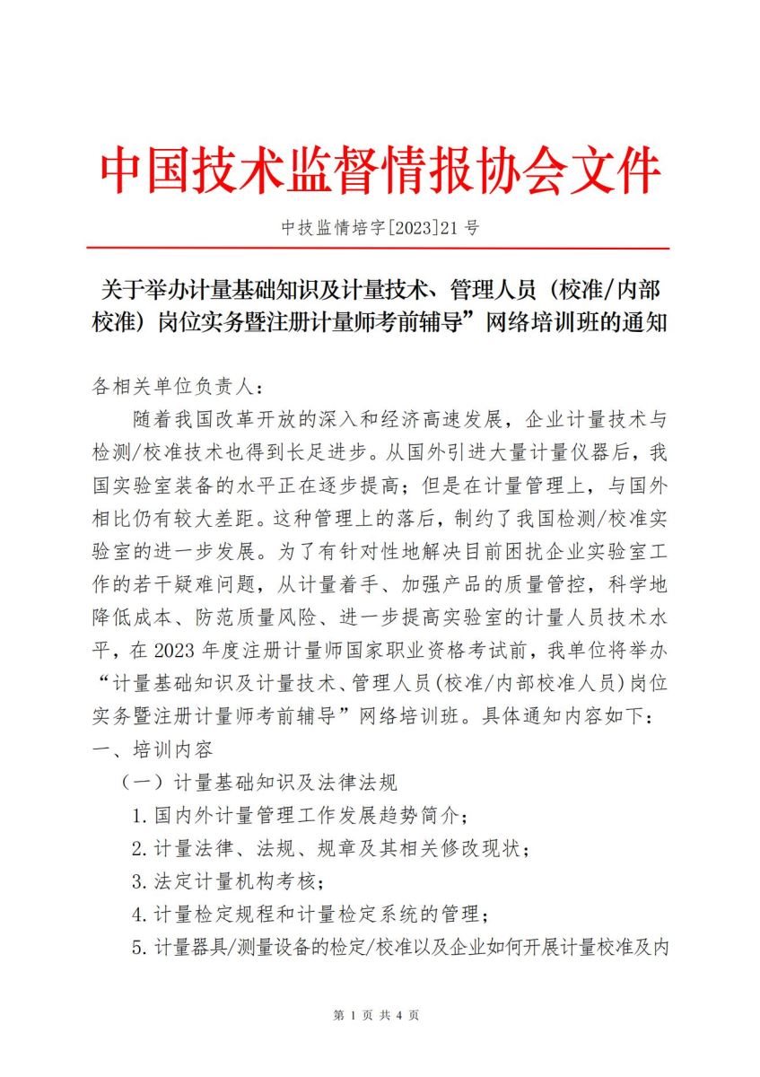 2023年度有关计量基础知识及校准内部校准人员岗位实务暨注册计量师考前辅导网络培训班的通知