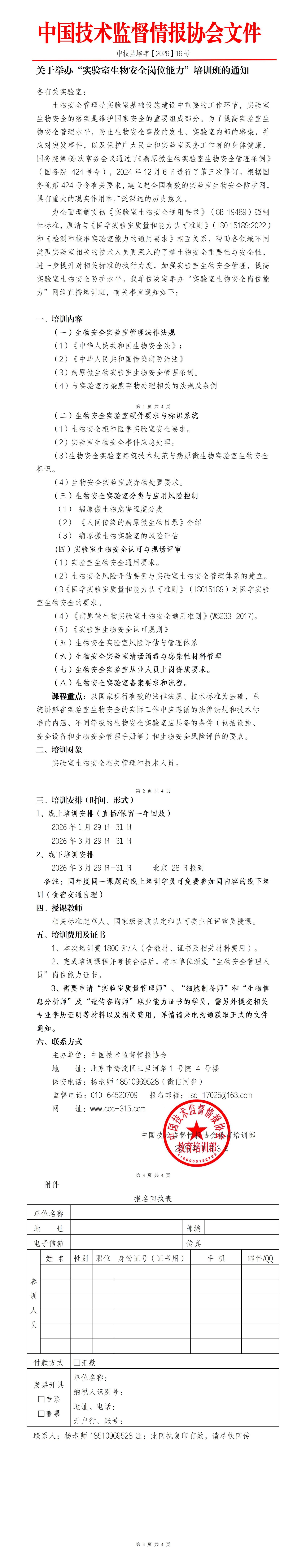 关于2026年1月29日-31日举办“实验室生物安全岗位能力”培训班的通知