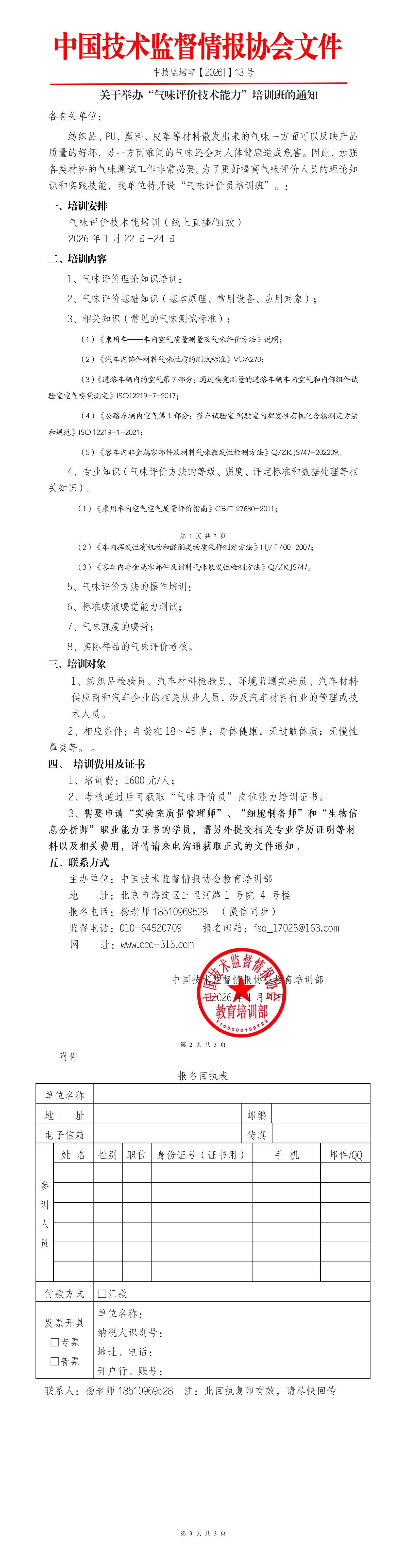 关于2026年1月22日-24日举办“气味评价技术能力”培训班的通知