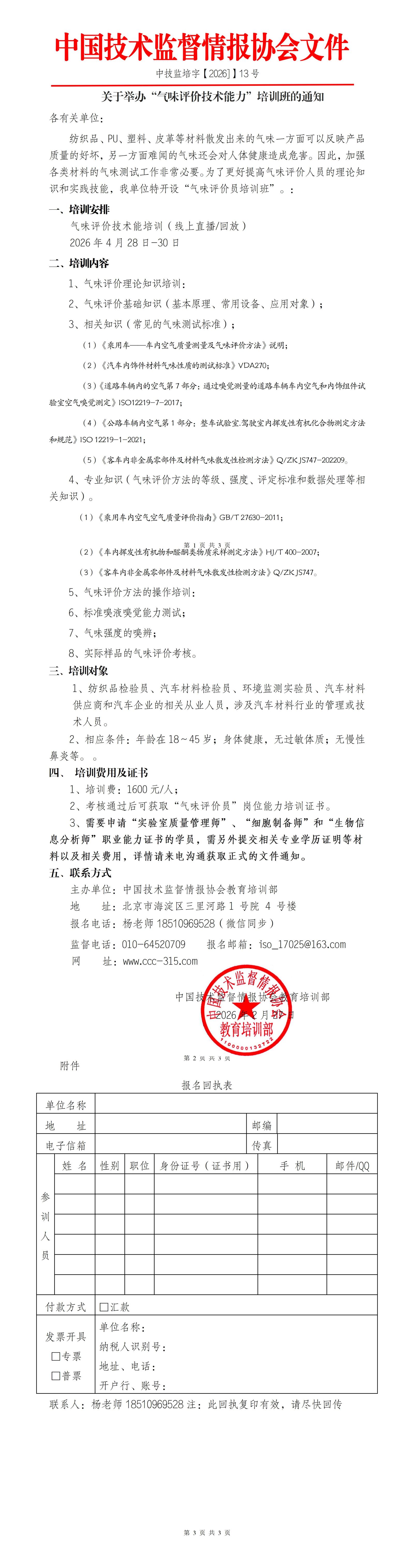 关于2026年4月28日-30日举办“气味评价技术能力”培训班的通知